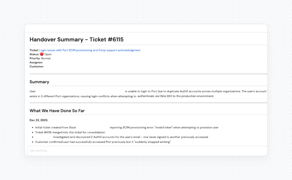 Rather than a brief paragraph, the Handover Support Ticket agent generates a comprehensive brief that can be copied directly into an internal note. It includes a full chronological timeline (e.g., "Anna did this, then we opened a Jira bug"), steps to reproduce, additional observations, current hypotheses capturing where the previous engineer's investigation left off, instructions on how to verify the fix, and immediate next steps for the new owner. The result is a detailed handover with the full context of the situation.